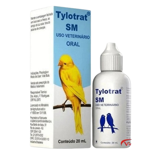 Tylotrat Oral SM 20ml - SM Tylotrat Oral SM age com eficácia no tratamento das complicações respiratórias de origem bacteriana, Micoplasmose e CRD das aves, causadas por Mycoplasma gallisepticum e Mycoplasma sinoviae. É indicado também para o tratamento do peito seco.